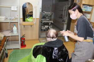 12月に入り、利用者の方から新年に向けて散髪をしてほしいとほとんどの利用者が散髪をされています。通常理容師は1名ですが今月は2名体制・2日にかけて新年を迎える準備に大忙しです