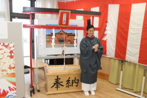 今年も開催 あじさいの郷 あじさい神社 外国人が神主役をしていただいて、お賽銭・絵馬奉納・おみくじ引きと楽しんでいただいています。