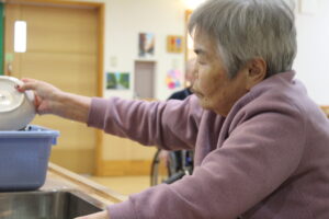 食べ終わった食器を洗っていただきました。(^_-)-☆あじさいには利用者用のキッチンがあります。「もうないの?」って丁寧に、なれた手つきでやっておられる姿を見て本当にすごいなって思いました