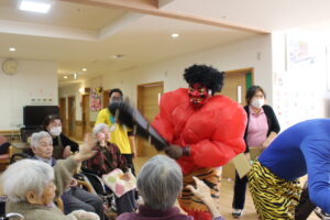 ブログ 表示月を選択 2026年2月 (7) 2026年1月 (67) 2025年12月 (78) 2025年11月 (54) 2025年10月 (77) 2025年9月 (74) 2025年8月 (70) 2025年7月 (88) 2025年6月 (79) 2025年5月 (89) 2025年4月 (77) 2025年3月 (65) 2025年2月 (51) 2025年1月 (11) 選択してください 特養奥びわこ-(99) ショート奥びわこ-(100) あじさいの郷-(310) 小多機奥びわこ-(432) デイサービスすずらん-(13) 訪問介護すずらん-(1) 居宅支援すずらん-(9) 今日は節分2026.2.3あじさいの郷 2/3日節分の日 鬼がやってきて豆まき~ 無茶苦茶怖い鬼でこん棒を振り回しています。演出の煙から登場に利用者も「わー」って 豆の代わりにボールで「鬼わー外」福わー内 利用者と一緒に季節感を楽しみました。 そのあとは利用者と一緒に昔は「年の数だけ食べたよね」「いわしの料理をつくった」って昔の家族の話で盛り上がりました。 今日の昼食「イワシとちらし寿司」巻きずしは危ないからだせなかった、のりが怖いんだって・・・(^^)/ « 前へ一覧 次へ » 施設紹介 滋賀県湖北地域に7つの事業所 特別養護老人ホーム奥びわこ ショートステイ奥びわこ 地域密着型特別養護老人ホームあじさいの郷 小規模多機能型居宅介護事業所奥びわこ 地域密着型通所介護デイサービスすずらん 訪問介護事業所すずらん 居宅支援事業所すずらん 採用情報 入職後も尊徳会はしっかりサポート