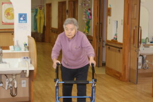 歩行器を上手に使用して自分の行きたい場所に行ける 車椅子になるとなかなか難しいと思います。どこ行くのって聞くと「あそこの隅っこは日光がよく当たって暖かいからすわろーって思って」自分の場所大切にしたいですね